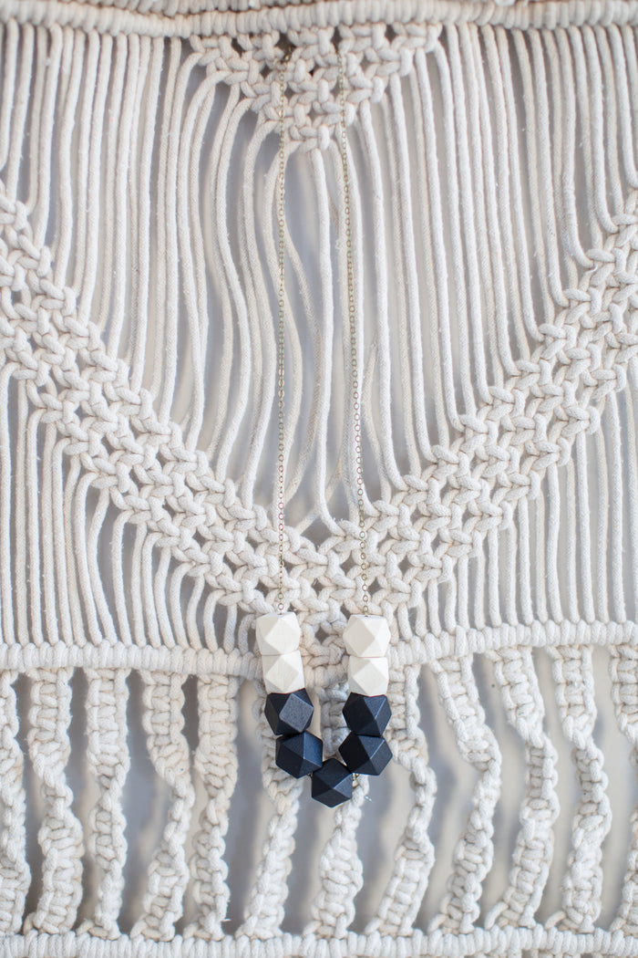 Wooden block bead necklace on brass chain.